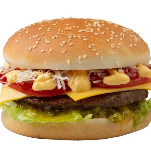 Сочный,большой бифштекс из 100% говядины 2 ломтика сыра, дополненный нежным салатом ,спелым томатом,хрустящим луком фри, с пряным релишем ,пармезаном и тягучим сыром на пышной булочке с кунжутом.
