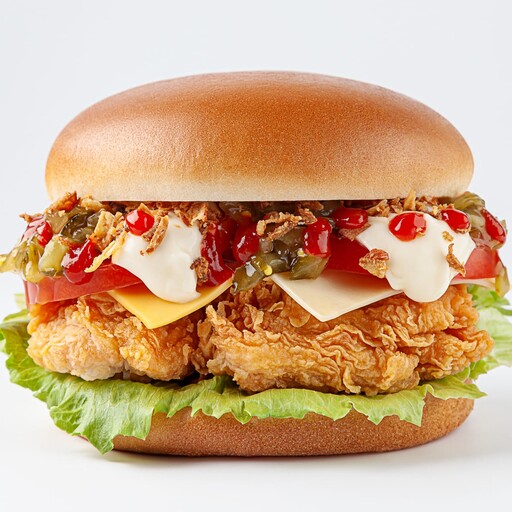 Это неповторимый бургер! Сливочная булочка Бриошь, сыр Чеддер, Эмменталь, хрустящий салат, помидор, жареный лук и сочное филе в острой панировке под жгучим соусом Шрирача и пряного соуса Релиш. Аппетитно и вкусно. 248,8ккал*