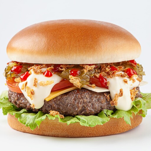 Попробуй новинку! Фирменная говядина под жгучим соусом Шрирача и пряного соуса Релиш с ломтиками сыра Чеддер и Эмменталь. А еще здесь майонез и овощи: салат айсберг, помидор, жареный лук на тающей булочке Бриошь. 350,7 ккал*
