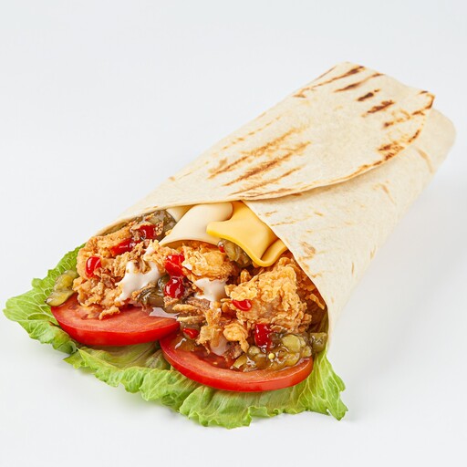 Наш новый острый рэп!!! Кусочки куриного филе в острой хрустящей панировке с ломтиками сыра Чеддер и Эмменталь, с листьями салата, свежими томатами, жареным луком, идеальное сочетание пряного соуса Релиш и обжигающей Шрирачи закрученными в пшеничную лепешку и поджаренный на тостере 243,1 ккал*
