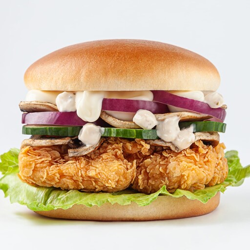 Большой и аппетитный бургер! Сливочная булочка Бриошь, нежный грибной соус подчеркивает вкус хрустящей курочки. А еще здесь есть: салат айсберг, свежий огурчик, красный лук, жареные шампиньоны. Специально для Вас! 228,9 ккал*
